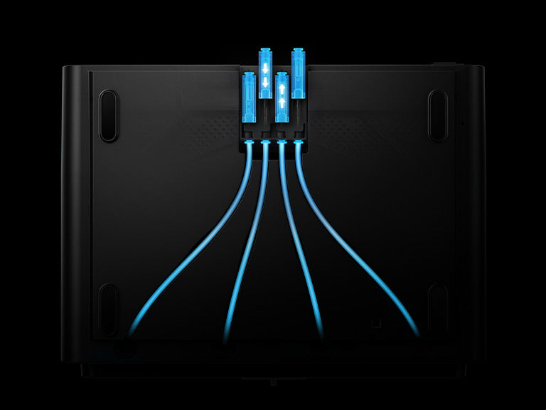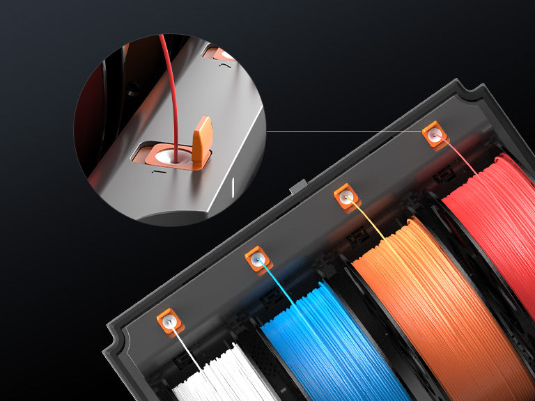Zaprojektowany z myślą o maksymalnej niezawodności, nowy system wyposażony jest w cztery niezależne silniki bezszczotkowe i mechanizm buforujący nowej generacji. Te komponenty współpracują ze sobą, zapewniając płynne, bezproblemowe podawanie i cofanie filamentu w każdym kanale.