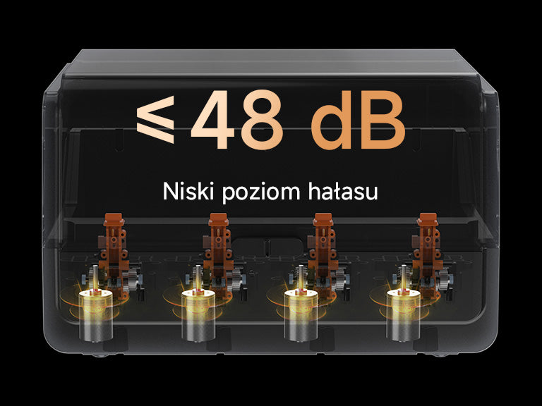 [2] Poziom hałasu drukarki ACE 2 Pro: 48 dB (drukowanie przy zamkniętych drzwiach), 55 dB (drukowanie z włączoną funkcją suszenia). (Pomiar wykonany w odległości 1 metra przed drukarką przez laboratorium Anycubic; wartości mogą się różnić w zależności od egzemplarza).