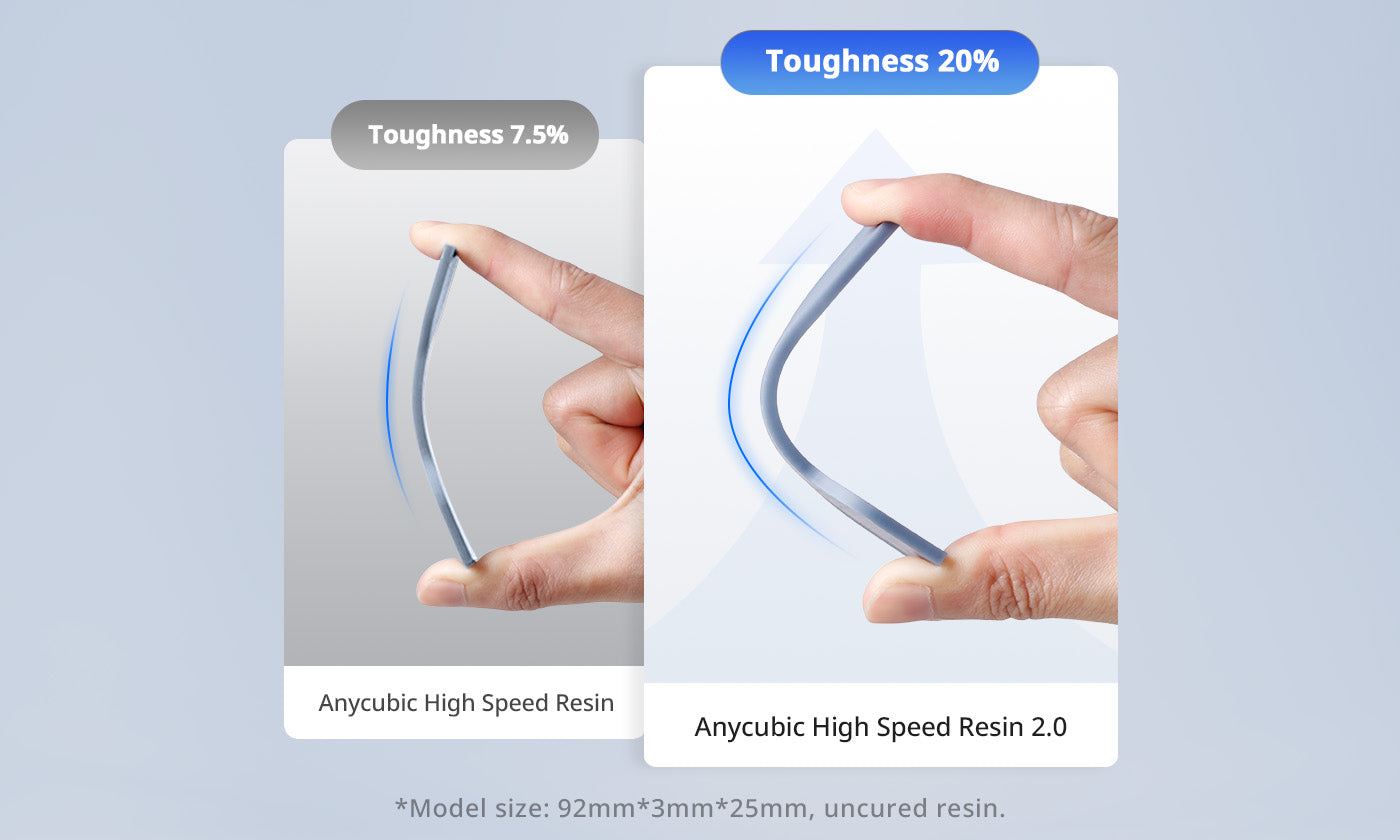 Dzięki ulepszonej formule, elastyczność żywicy Anycubic High Speed 2.0 wzrosła z 7,5% do 20% w porównaniu z żywicą Anycubic High Speed.