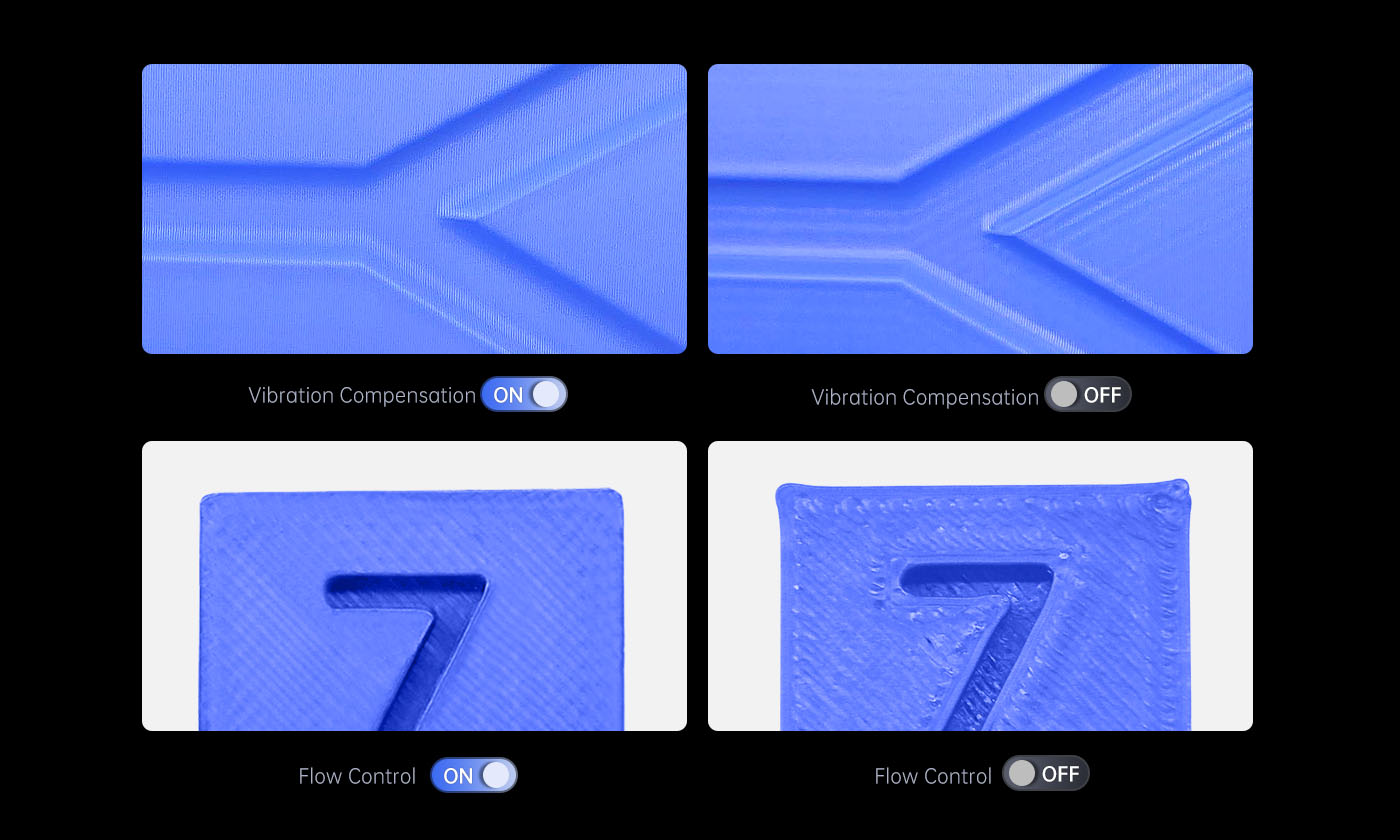 Dzięki funkcji 'Kompensacja drgań' uruchamianej jednym kliknięciem, wykrywanie częstotliwości rezonansowej na osi X/Y eliminuje linie pionowe i ślady wsporników, zapewniając stabilność druku. 'Kontrola przepływu' poprawia jakość warstw poprzez inteligentną kompensację retrakcji i uzupełniania, gwarantując jednolite i szczegółowe rezultaty.