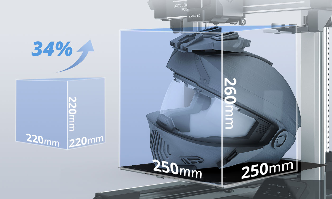 The Kobra 3 Combo features printing sizes up to 250 x 250 x 260mm, with a maximum printing volume of 4.29 gal (16.25L), increased by a whopping 34% compared to previous 3D printers.