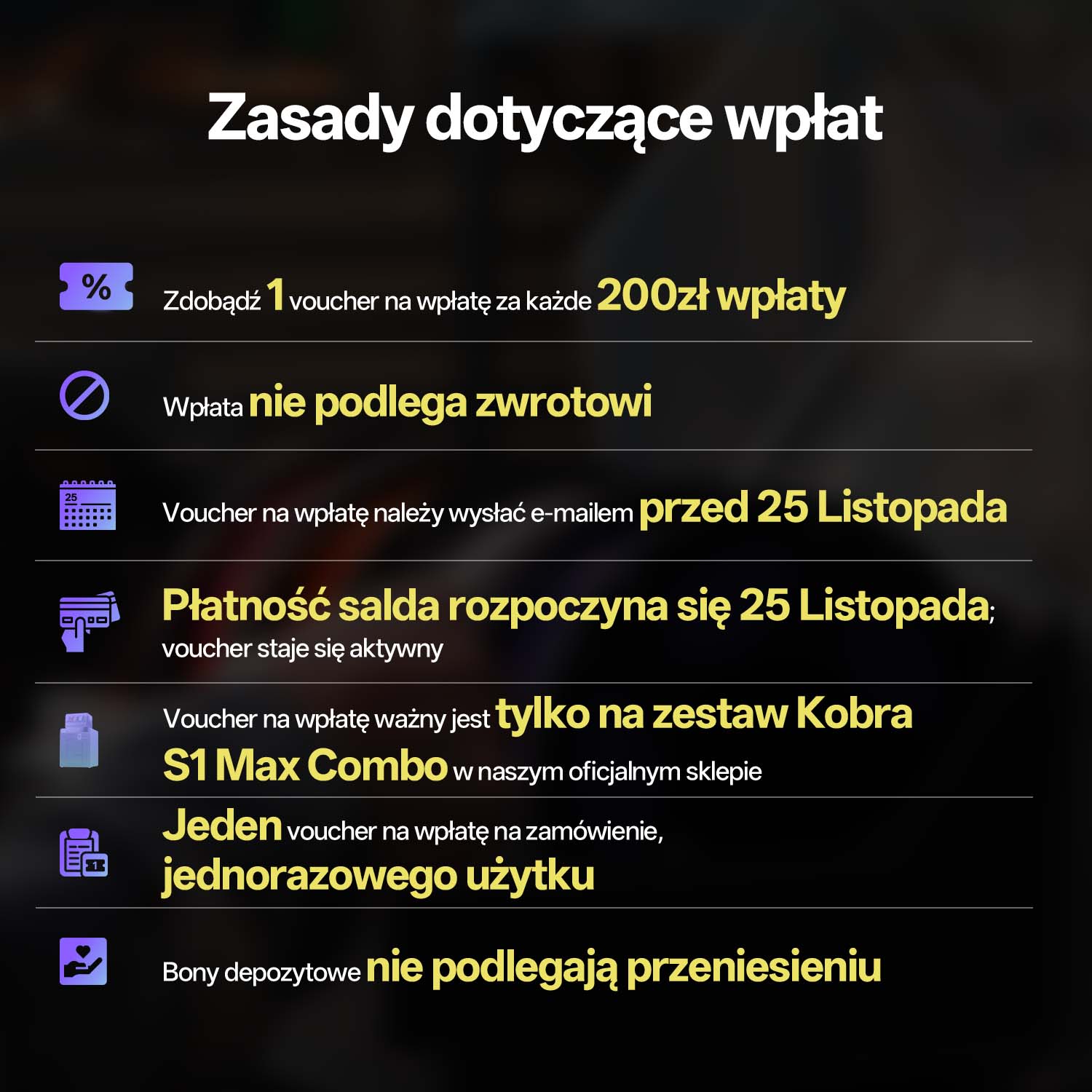 Po wpłacie depozytu automatycznie otrzymasz voucher o wartości 200zł dla Kobra S1 Max