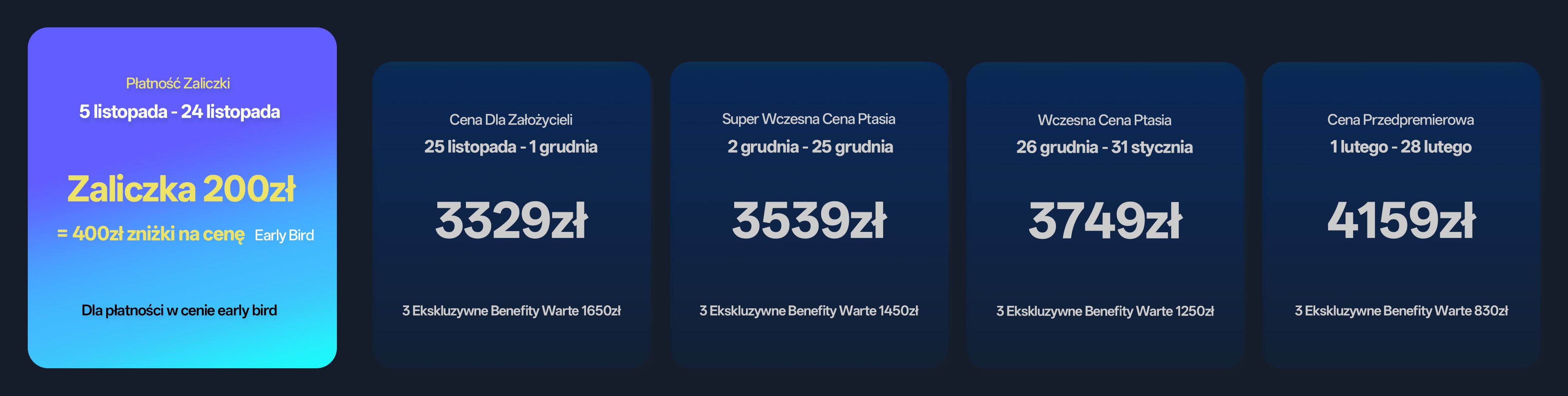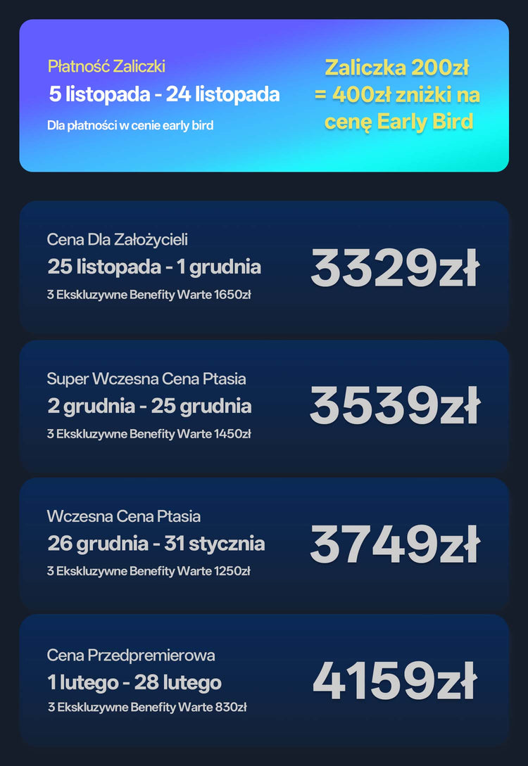 Depozyt 200zł, cena Early Bird 400zł Zniżki
