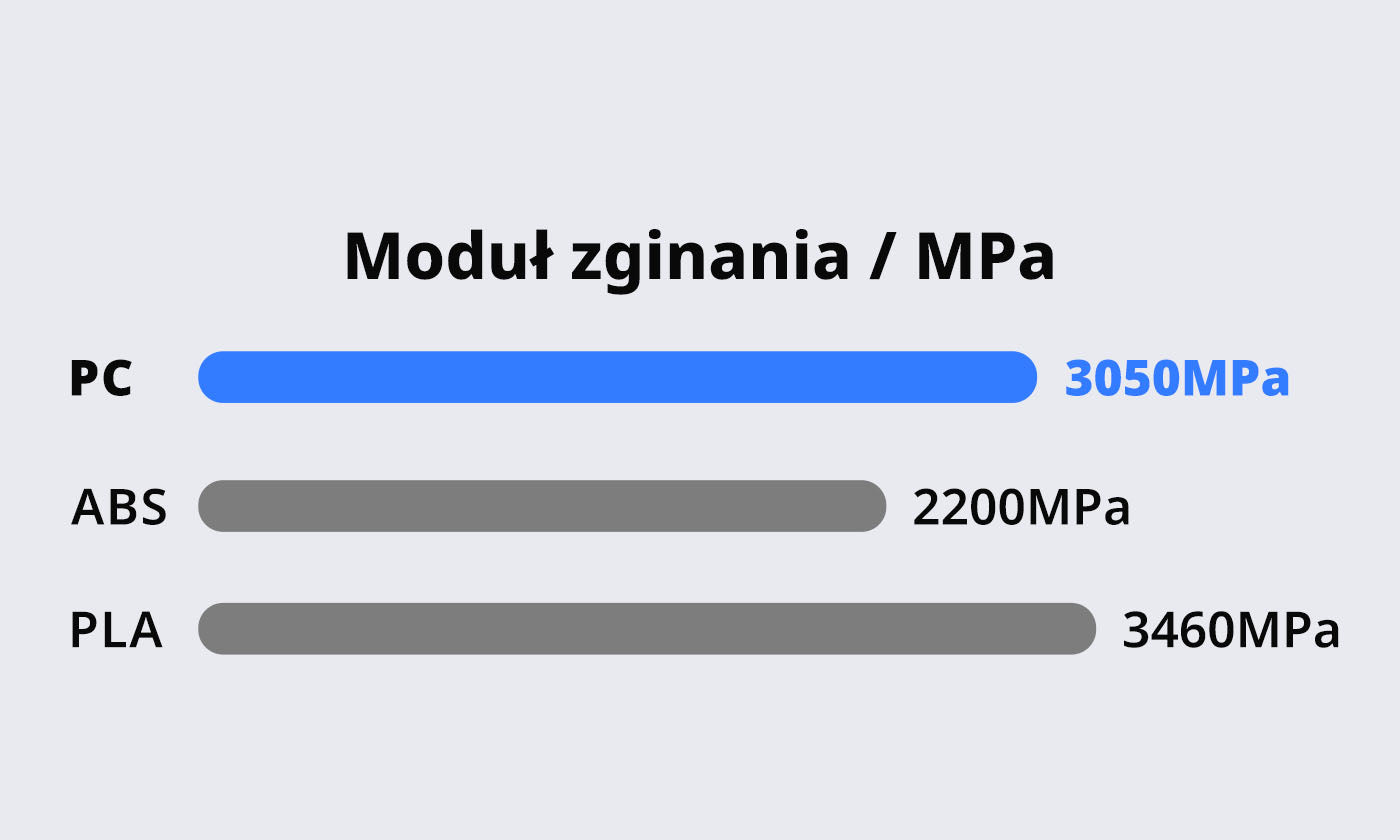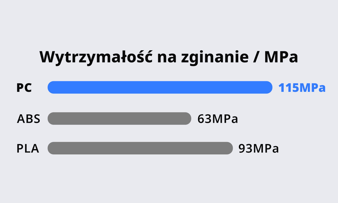 Zaprojektowany do zastosowań w warunkach dużego naprężenia, nasz filament PC oferuje wyjątkową wytrzymałość i udarność 42 kJ/m². Jest on znacznie mocniejszy niż ABS, dzięki czemu idealnie nadaje się do produkcji elementów narażonych na duże obciążenia, takich jak przekładnie robotów, komponenty dronów i sprzęt do użytku na zewnątrz. Wytrzymuje trudne, długotrwałe warunki bez pęknięć i awarii.
