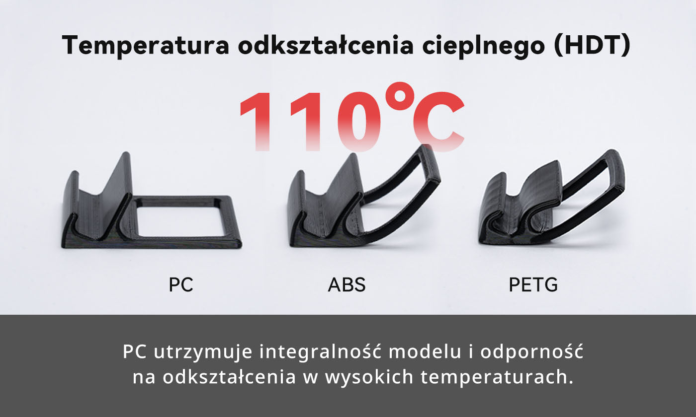 Filament PC firmy Anycubic został zaprojektowany do pracy w wysokich temperaturach. Dzięki wyjątkowej temperaturze ugięcia pod obciążeniem (HDT) wynoszącej 110°C, zapewnia doskonałą odporność termiczną i stabilność strukturalną. Oznacza to, że wydruki – takie jak oprawy zewnętrzne i obudowy lamp – będą odporne na odkształcanie i pękanie nawet pod wpływem długotrwałego ciepła i naprężeń.