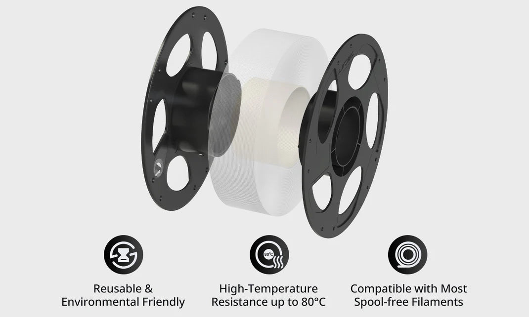 Wielorazowa szpula z filamentem wyposażona jest w gwintowany system połączeń, który zapewnia większą stabilność podczas pracy z filamentami bez szpuli. Taka konstrukcja znacznie zmniejsza ryzyko splątania, rozproszenia filamentu i błędów obsługi.