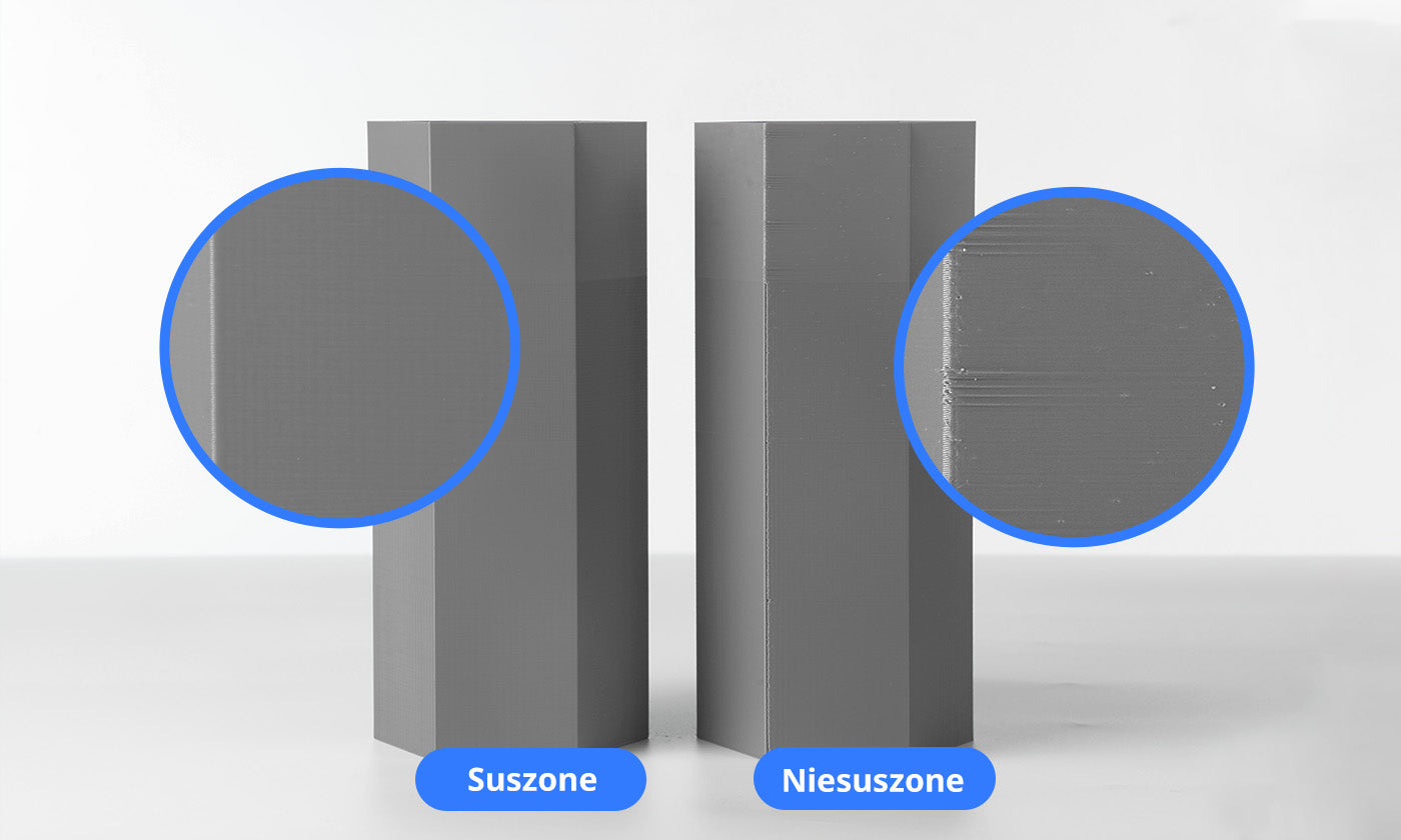 Przed drukowaniem należy wysuszyć filamenty PETG i przechowywać je w środowisku o kontrolowanej wilgotności, aby zapobiec powstawaniu pęcherzyków powietrza podczas drukowania.